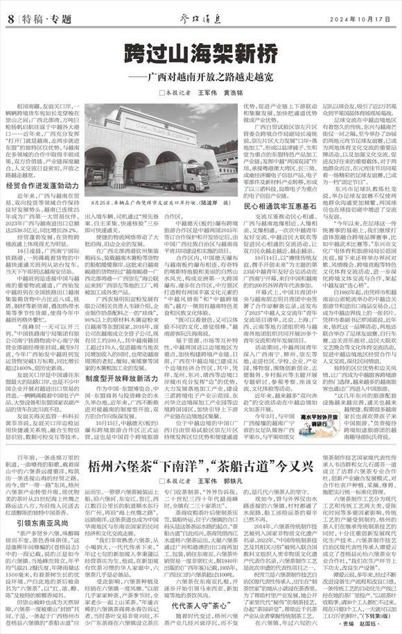 祖國南疆,友誼關口岸,一輛輛跨境貨車宛如長龍穿梭在崇山之間;廣西北部灣,萬噸巨輪揚帆啟航往返于中越各大港口……近年來,廣西充分發揮“打開門就是越南,走兩步就進東盟”的獨特區位優勢,與越南在多領域的合作中取得豐碩成果,雙方價值鏈、產業鏈深度融合,人文交流日益密切,開放之路越走越寬。