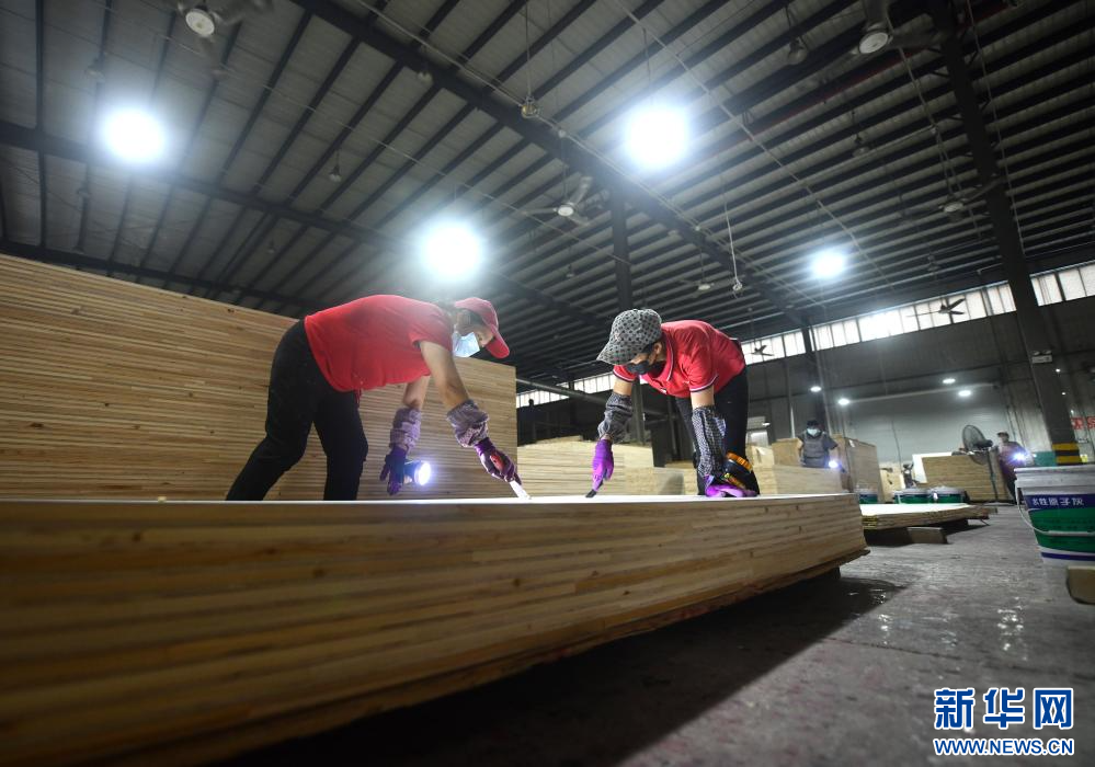 在廣西融水苗族自治縣粵桂協作產業園一家林木加工企業,工人在生產線上作業(10月18日攝)。