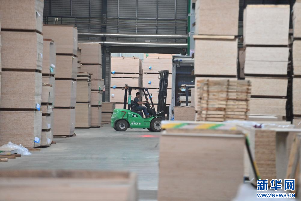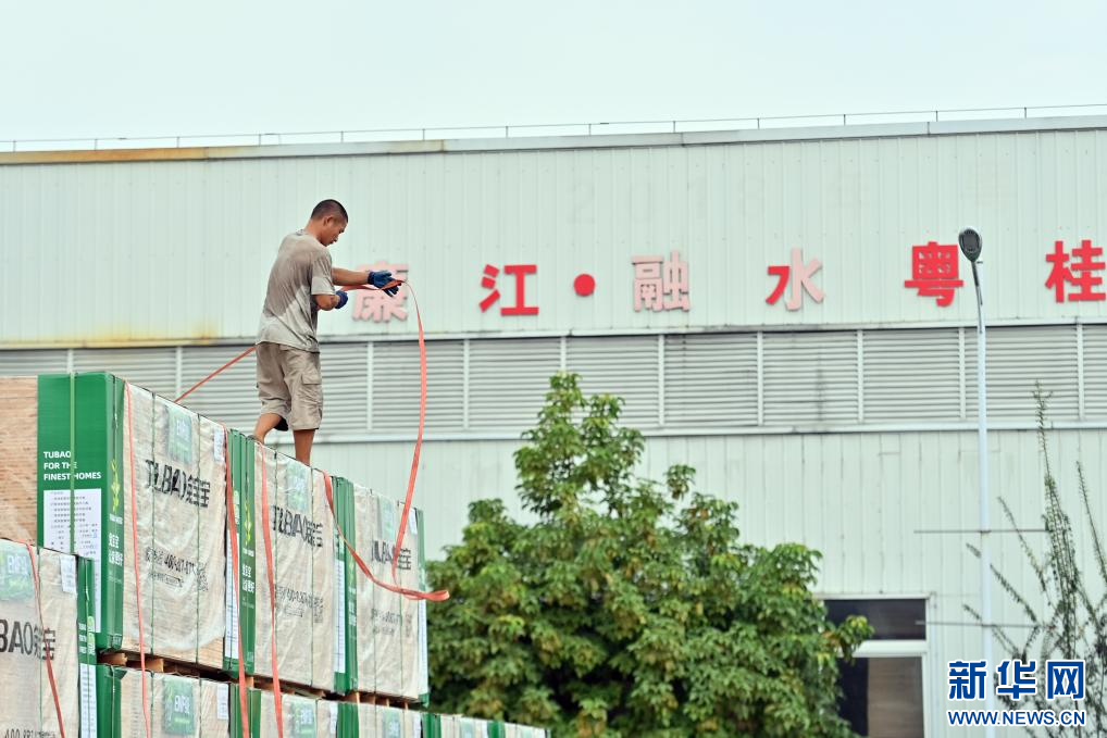 在廣西融水苗族自治縣粵桂協作產業園一家林木加工企業,工人在裝載產品(10月18日攝)。