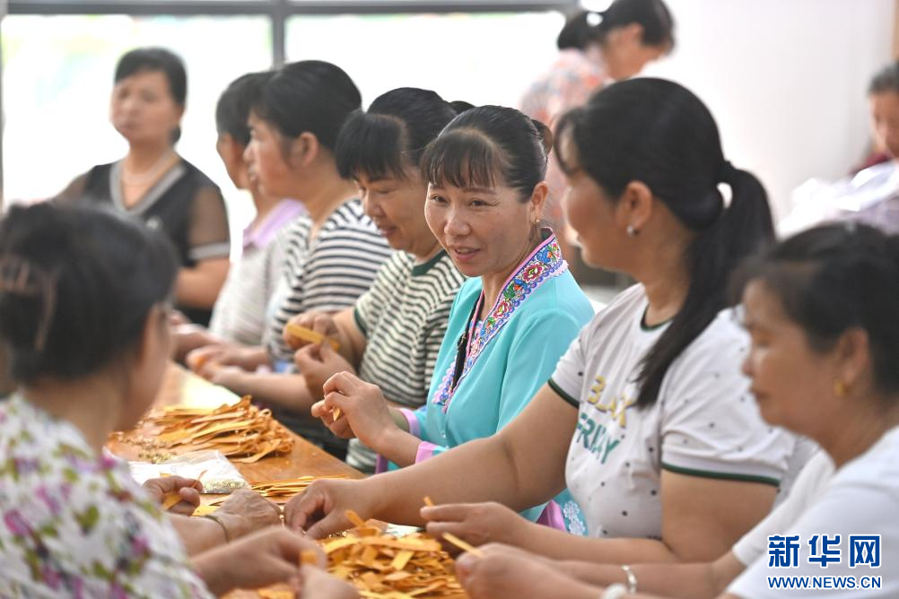 在融水苗族自治縣苗家小鎮易地扶貧安置點粵桂協作幫扶車間,群眾在制作手工藝品(6月20日攝)。