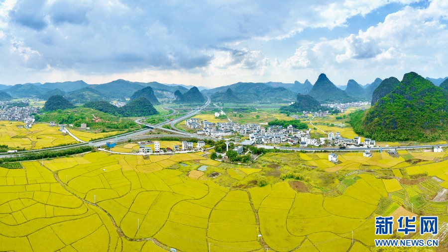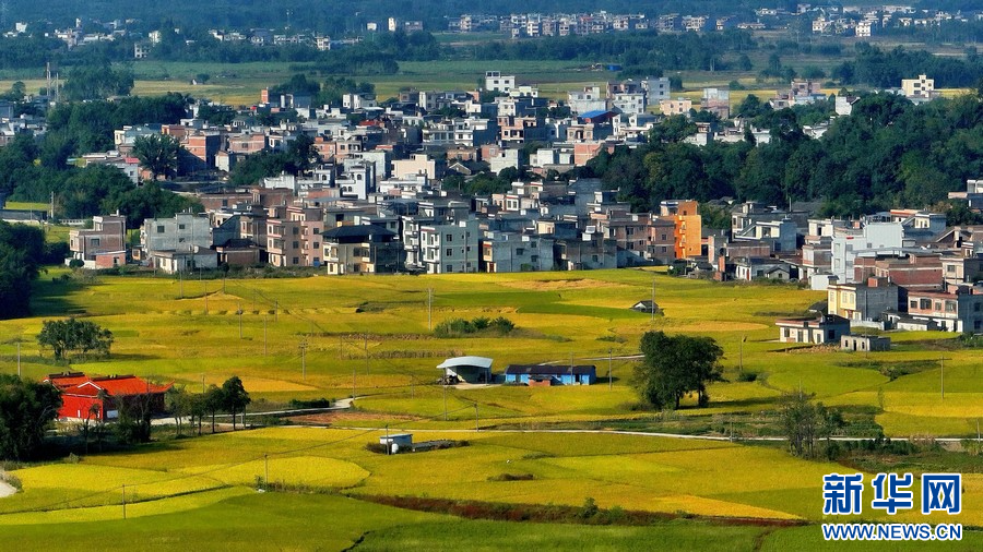 近日,廣西賀州市鐘山縣回龍鎮的水稻豐收在即,金黃的稻田、錯落有致的村莊與遠處的高速路交相輝映,繪就一幅金秋豐收畫卷。(鄧靜子 吳桂行)