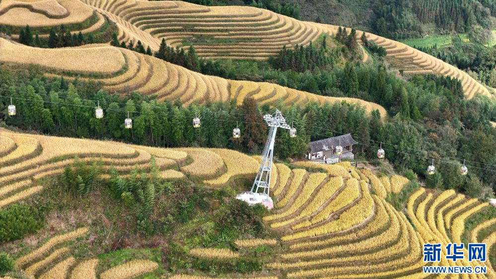 10月22日,游客乘坐纜車在廣西龍勝各族自治縣龍脊鎮梯田觀光。