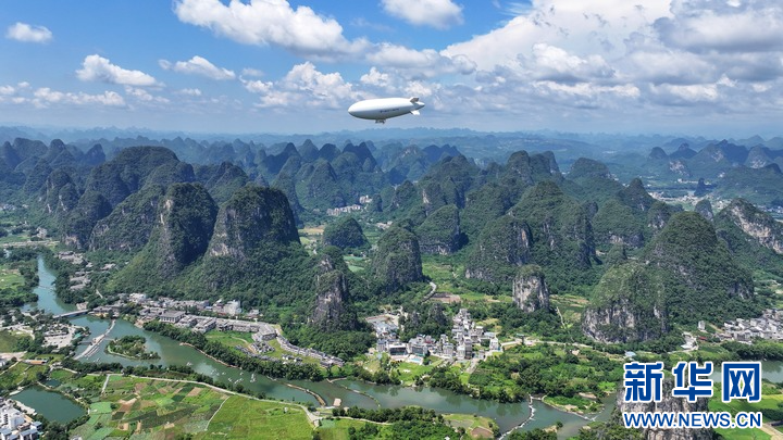 “祥云”AS700載人飛艇在廣西陽朔進行演示飛行(無人機照片)。(中國航空工業集團特種飛行器研究所供圖)