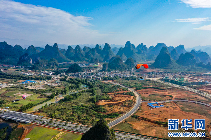 一架滑翔傘在陽朔上空飛行(2019年11月14日攝)。新華社記者 曹祎銘 攝