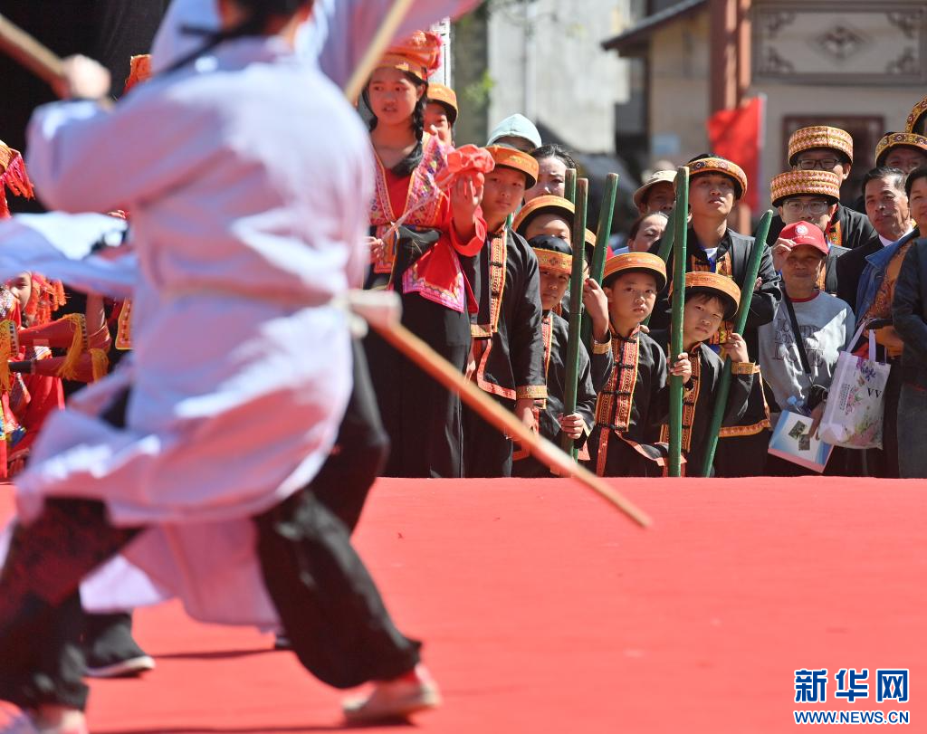 10月23日,群眾在梧州市蒙山縣長坪瑤族鄉圖騰廣場觀看民俗表演。