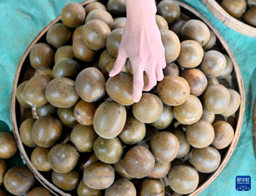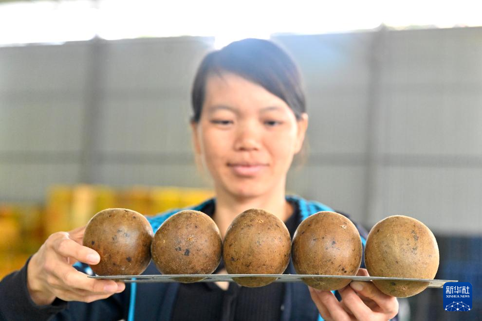 10月29日,在廣西柳州市鹿寨縣拉溝鄉,工人在收購點里展示收購的特級羅漢果。
