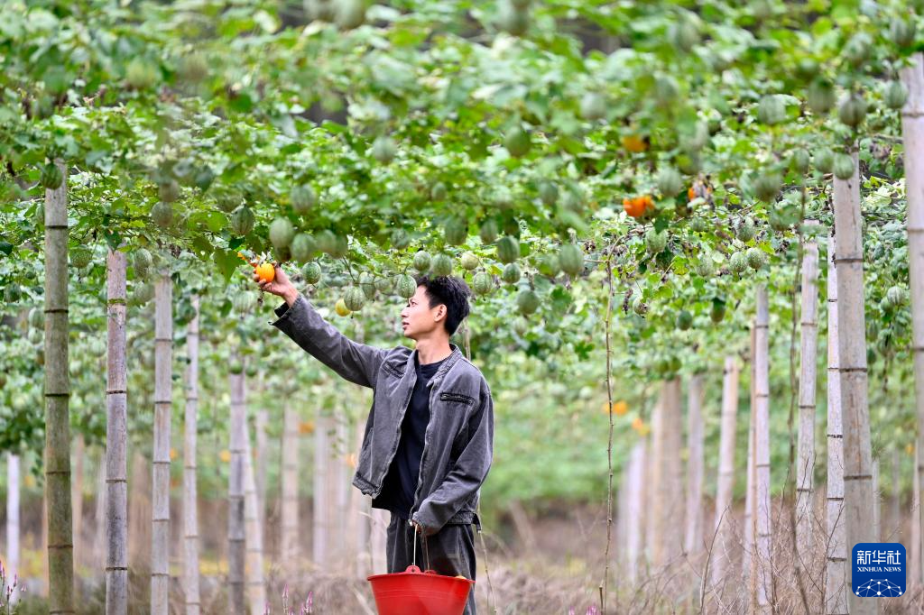 10月29日,在廣西柳州市鹿寨縣拉溝鄉,工人在中藥材種植基地里采摘吊瓜。