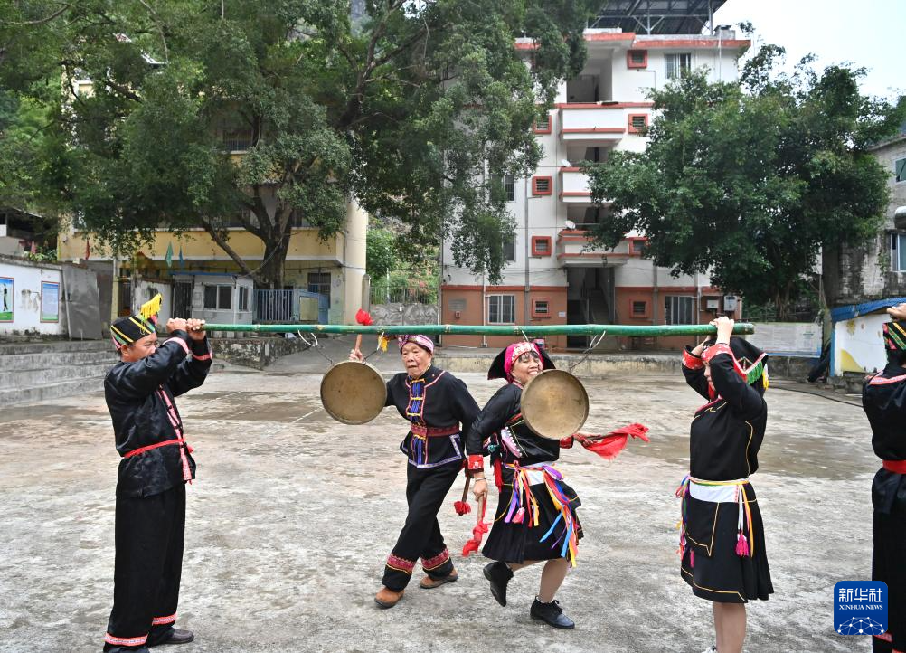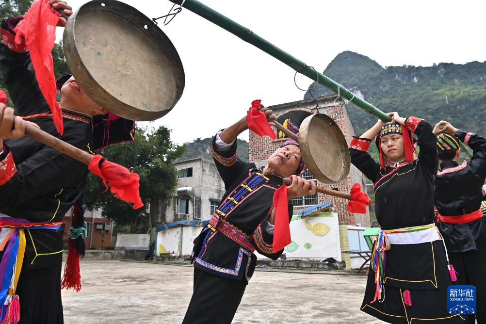 阮桂陸(右)和藝術團成員在田東縣作登瑤族鄉梅林村表演金鑼舞(10月28日攝)。