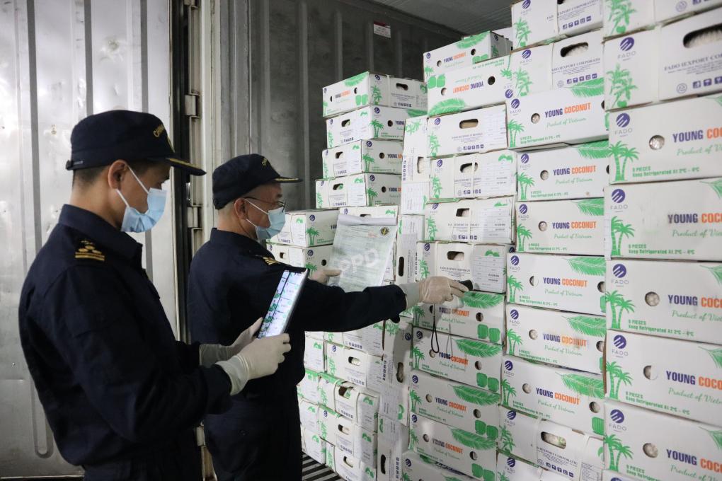 憑祥海關關員在核對進境越南鮮食椰子標簽。(憑祥海關供圖)