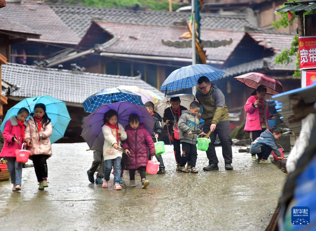 在烏英苗寨,駐村工作隊隊員鄭昌昊帶著孩子們在小雨中打掃衛生(2021年4月14日攝)。