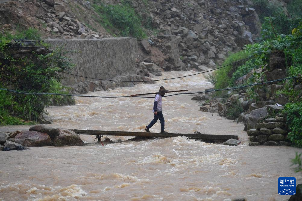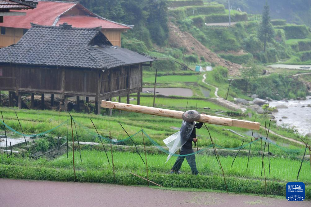 在烏英苗寨,村民梁秀前冒雨為新建公共木樓搬運木材(2019年7月6日攝)。