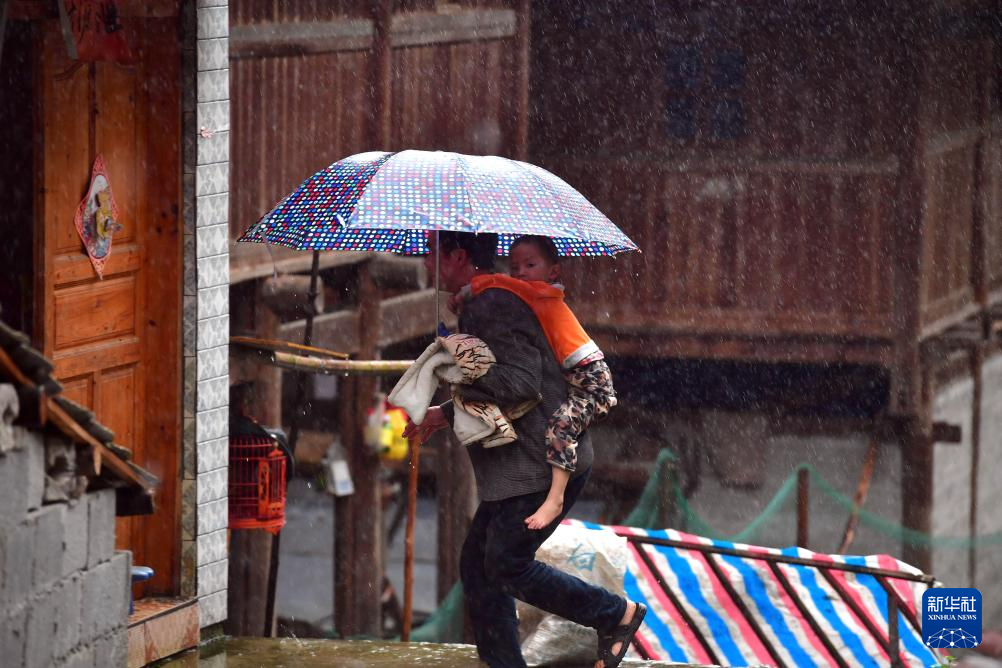 烏英苗寨村民吳新仁在雨中背著兒子回家(2018年6月4日攝)。