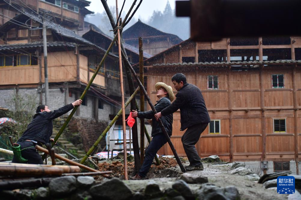 烏英苗寨村民在雨中搬運木材,準備建新木樓(2018年5月9日攝)。