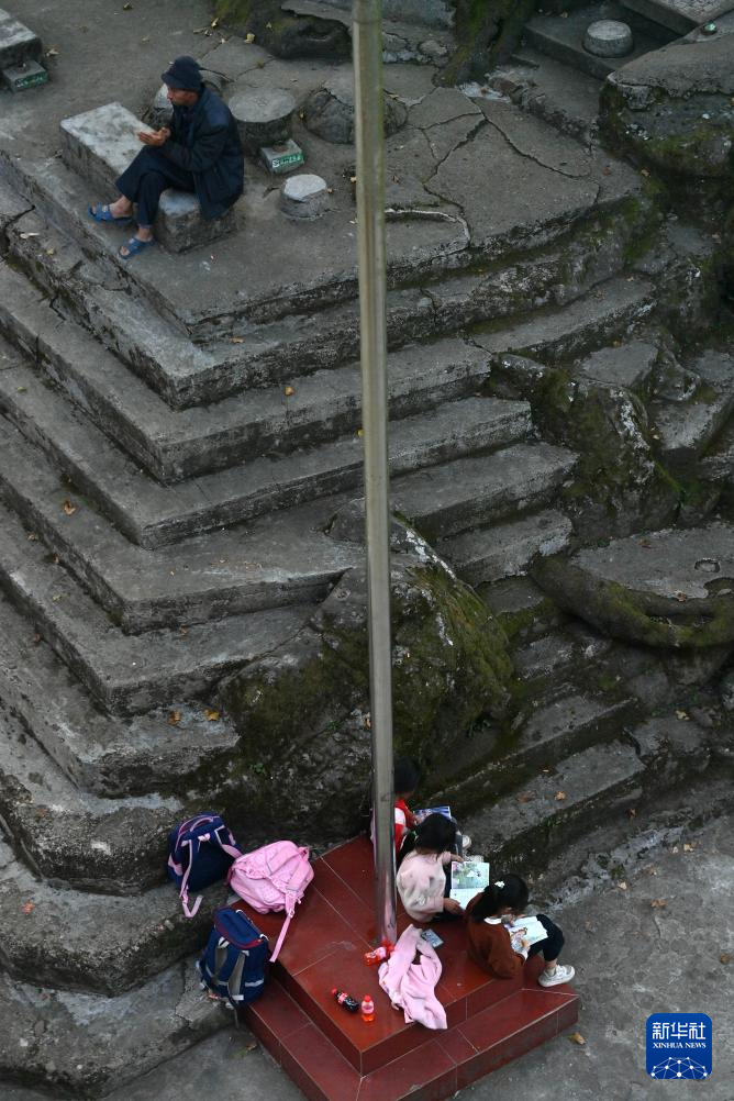 下午放學后,烏英苗寨教學點的孩子們在旗臺上看書(2024年11月7日攝)。