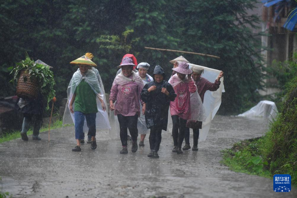 在烏英苗寨,婦女們冒雨去參加集體勞動(2019年7月6日攝)。