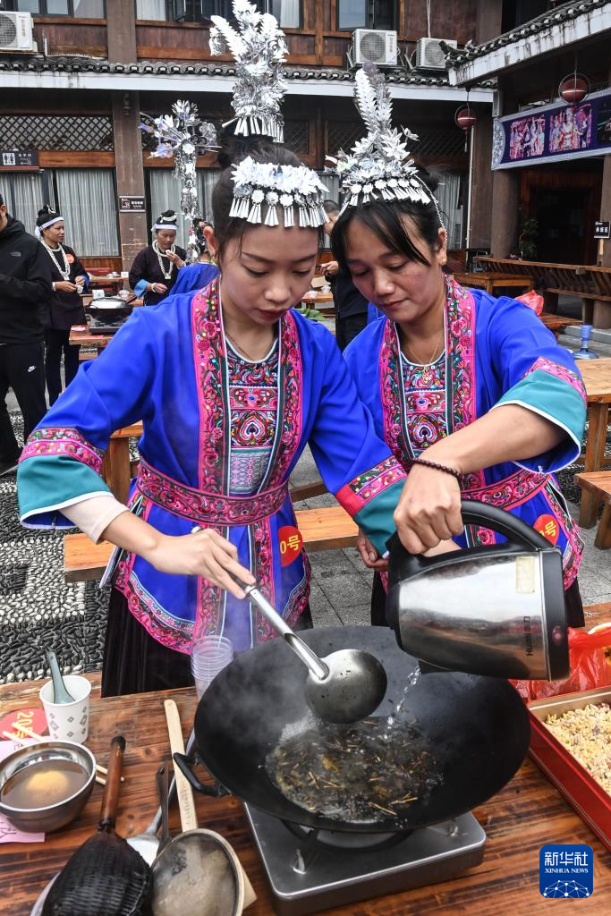 11月9日,在廣西三江侗族自治縣月也侗寨,侗族婦女在打油茶。