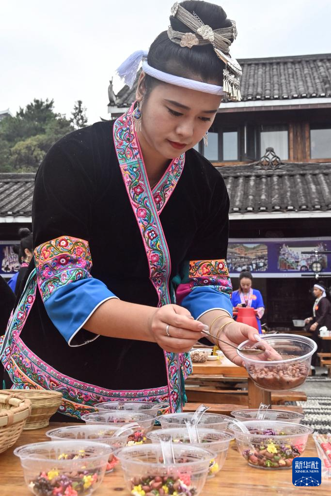 11月9日,在廣西三江侗族自治縣月也侗寨,一名侗族婦女在擺放油茶宴食品。