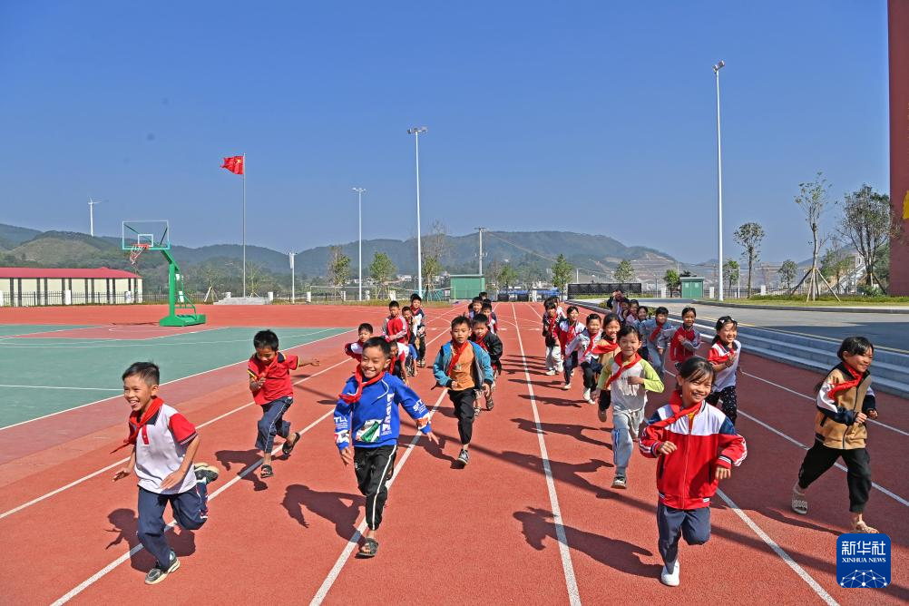 11月7日,孩子們在廣西欽州市靈山縣舊州鎮石橋小學新校區跑步。