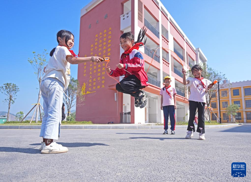 11月7日,孩子們在廣西欽州市靈山縣舊州鎮石橋小學新校區跳繩。