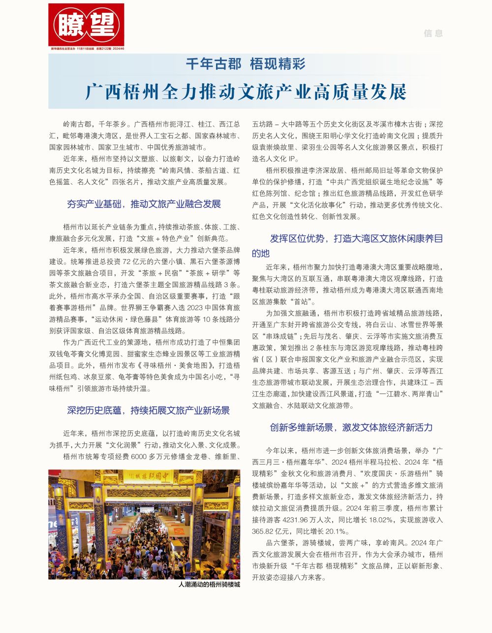 2024年第46期《瞭望》刊文《千年古郡 梧現精彩 廣西梧州全力推動文旅產業高質量發展》,全文如下: