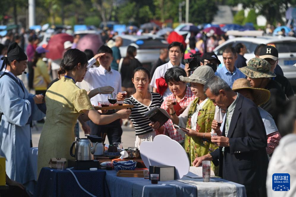 11月12日,在梧州蒼海公園,游客和市民在品嘗六堡茶。