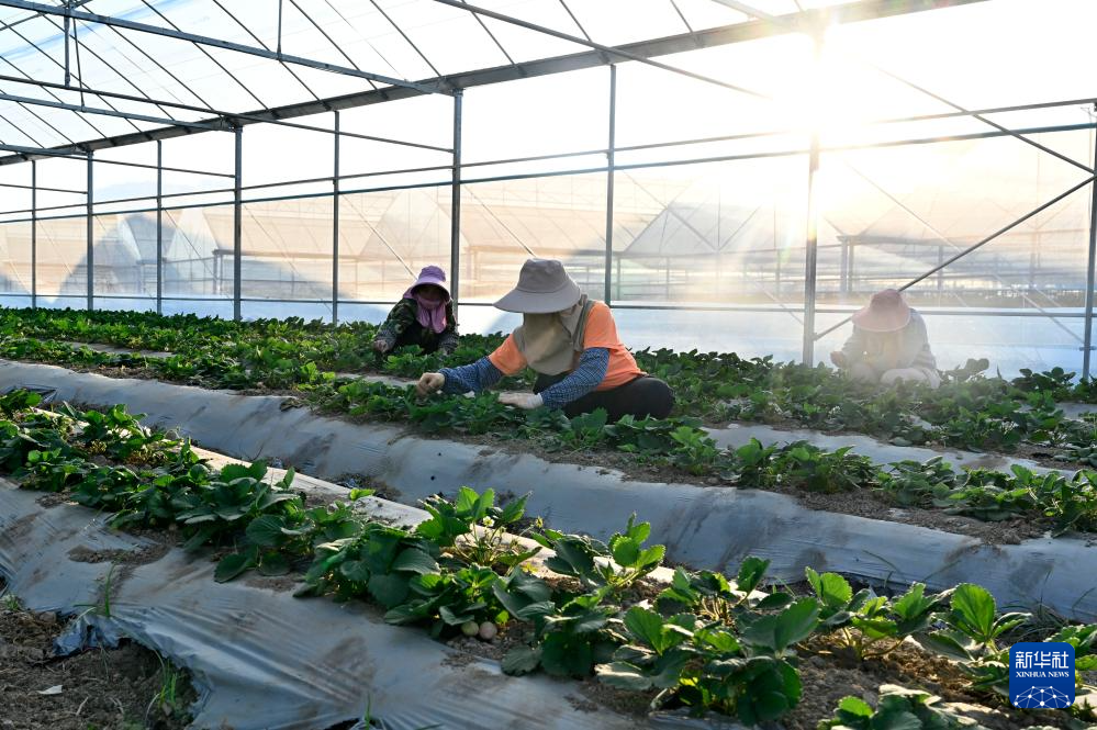 11月19日,在柳州市魚峰區白沙鎮王眉現代設施農業示范基地,村民在草莓大棚里管護作業。