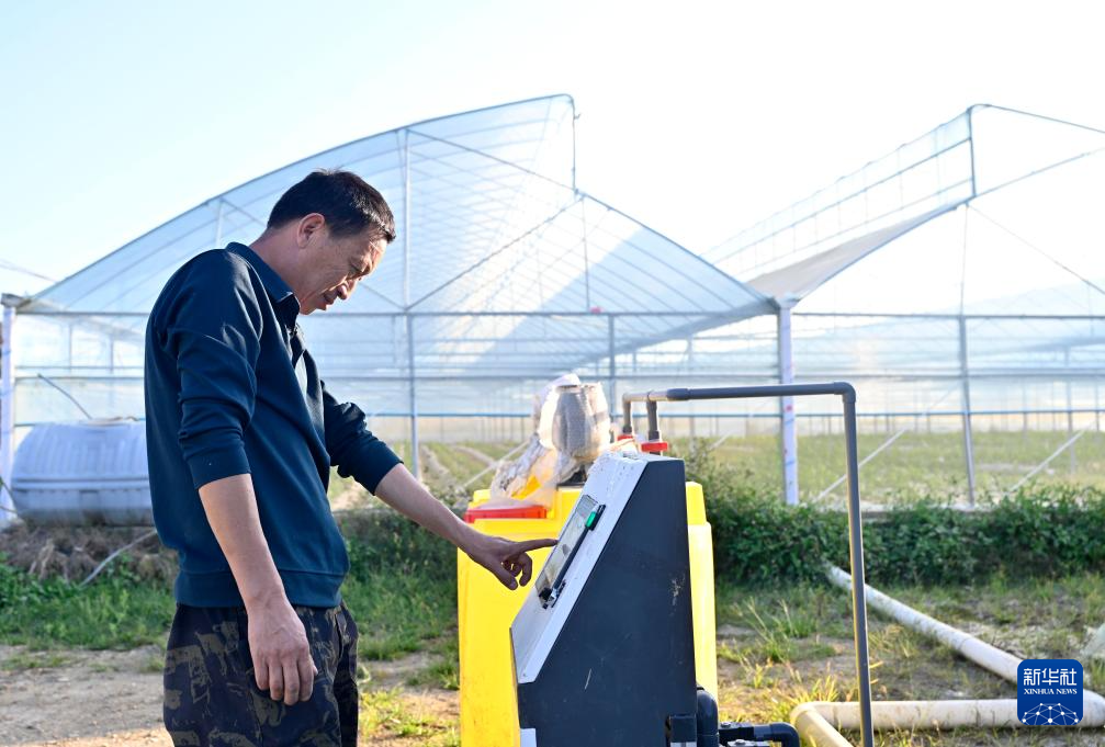 11月19日,在柳州市魚峰區白沙鎮王眉現代設施農業示范基地,技術人員在大棚外操作水肥維護一體化滴灌設備。