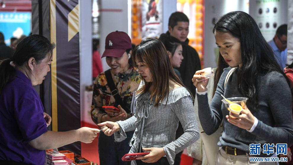 11月22日,在玉林國際香料會展中心的烹飪調料展位,游客和市民在品嘗美食。