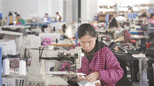 在忻城縣思練鎮易地扶貧搬遷安置點鴻源小區標準廠房佰成皮具有限公司生產車間,工人們在崗位上作業。 韋祎/攝