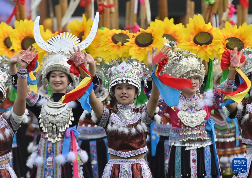 在融水苗族自治縣民族體育公園舉行的蘆笙斗馬節開幕式現場,當地群眾在展示民族文化(11月23日攝)。