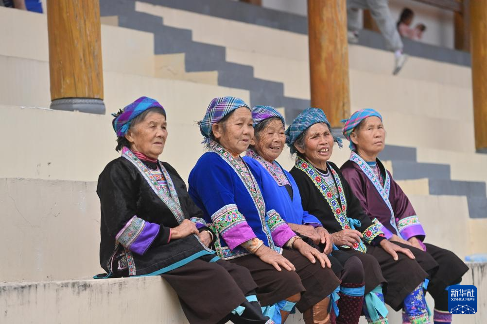在融水苗族自治縣民族體育公園,老人們在看臺上觀看民族歌舞表演(11月23日攝)。