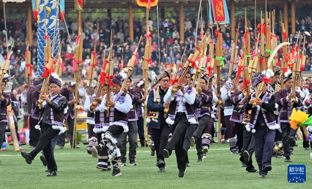 在融水苗族自治縣民族體育公園舉行的蘆笙斗馬節開幕式現場,當地群眾在展示蘆笙文化(11月23日攝)。