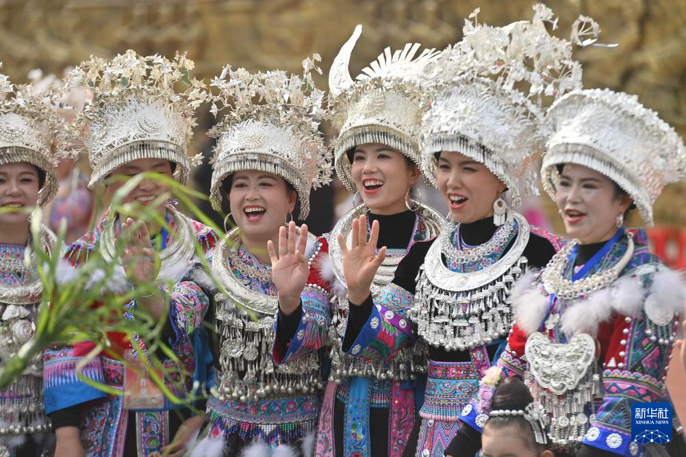 在融水苗族自治縣民族體育公園舉行的蘆笙斗馬節開幕式現場,當地群眾身著節日盛裝與游客互動(11月23日攝)。