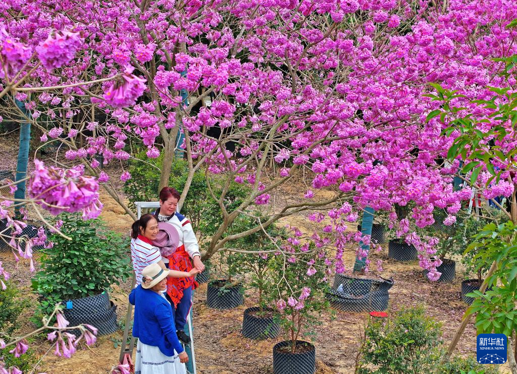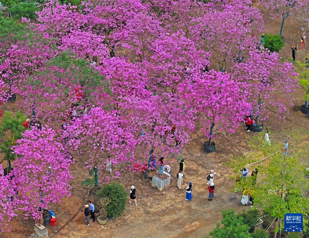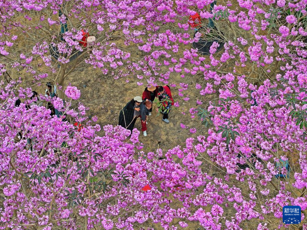 眼下,廣西南寧市三塘鎮十里花卉長廊紫花風鈴木盛放,粉紫色的花朵在冬日里格外艷麗,吸引游客前來觀賞。