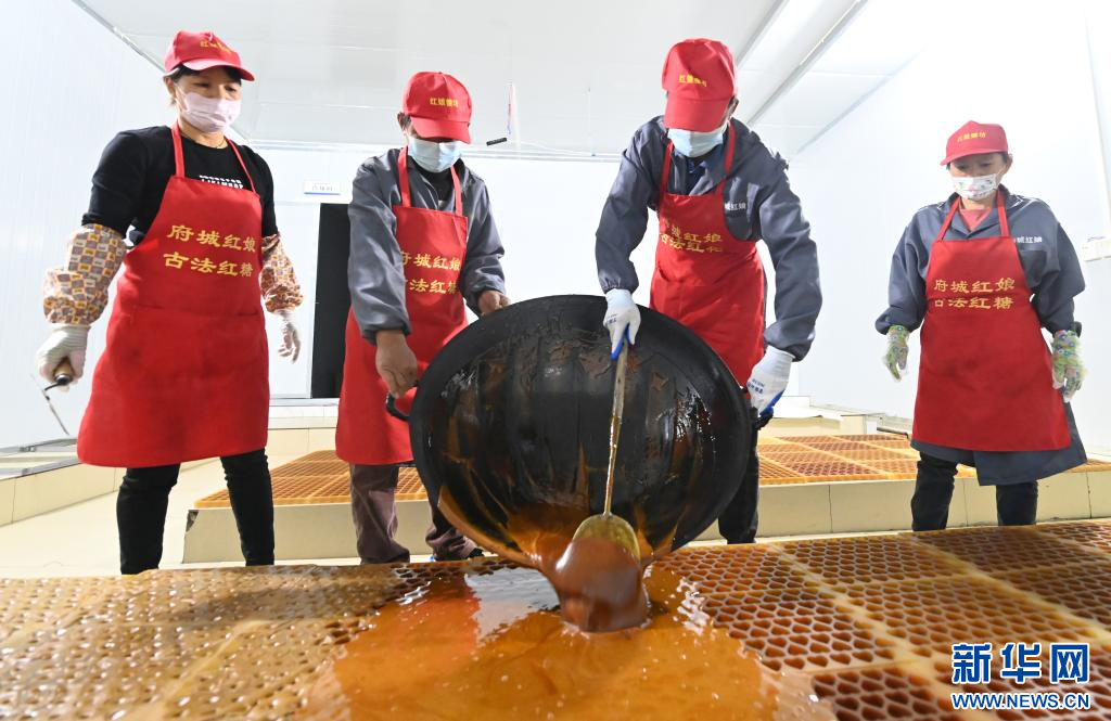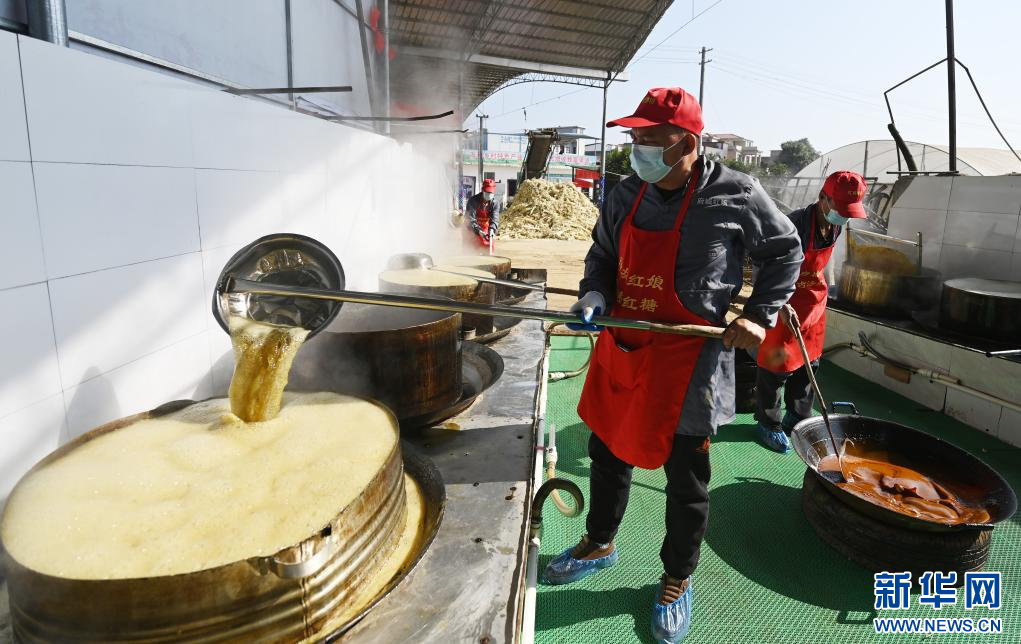 當日,廣西南寧市武鳴區府城鎮富良村定旺屯村民們加緊趕制紅糖,供應即將到來的春節年貨市場。