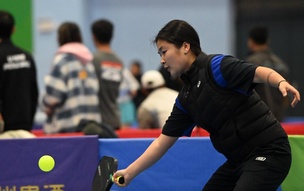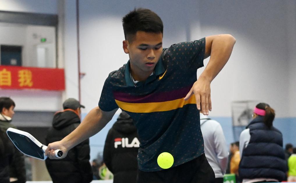 12月21日,在廣西桂林電子科技大學球類館,匹克球賽選手在比賽中。