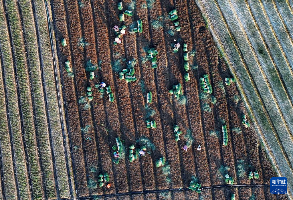 2024年11月3日,覺山村村民在田間采收香蔥(無人機照片)。