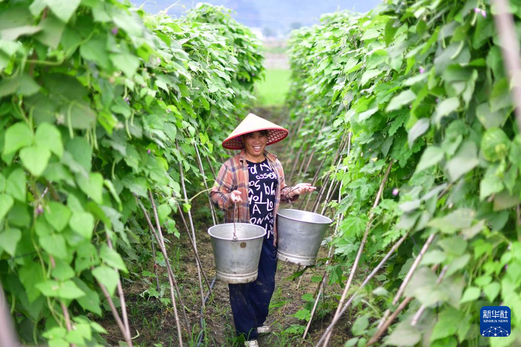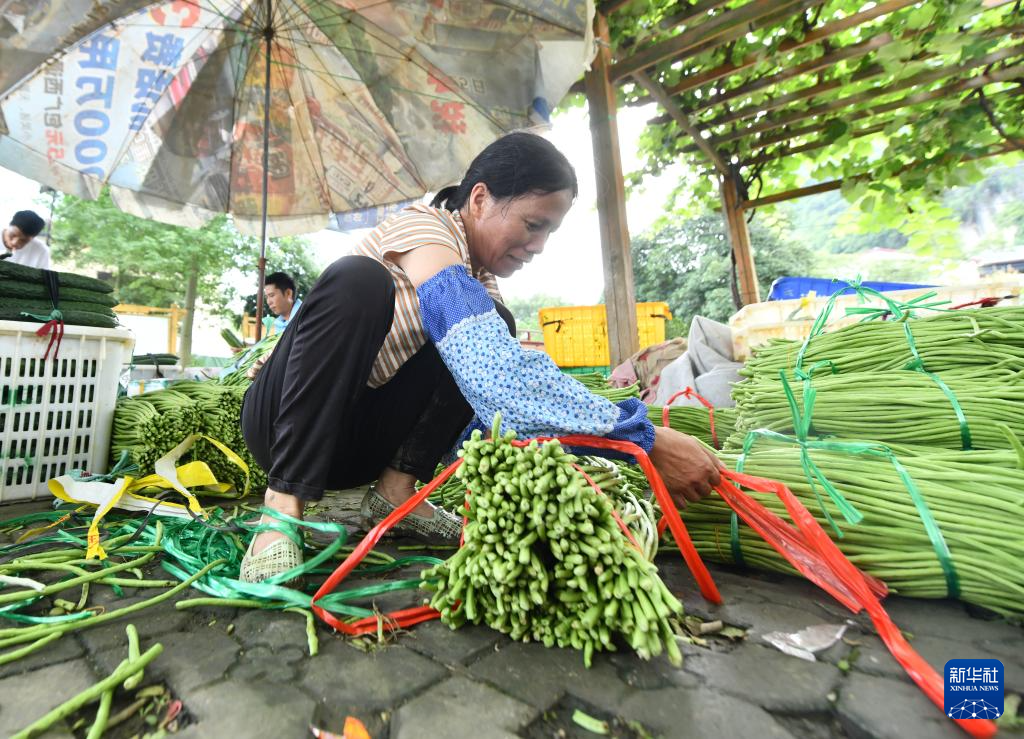 2024年5月25日,覺山村村民在整理豆角,準備供應市場。