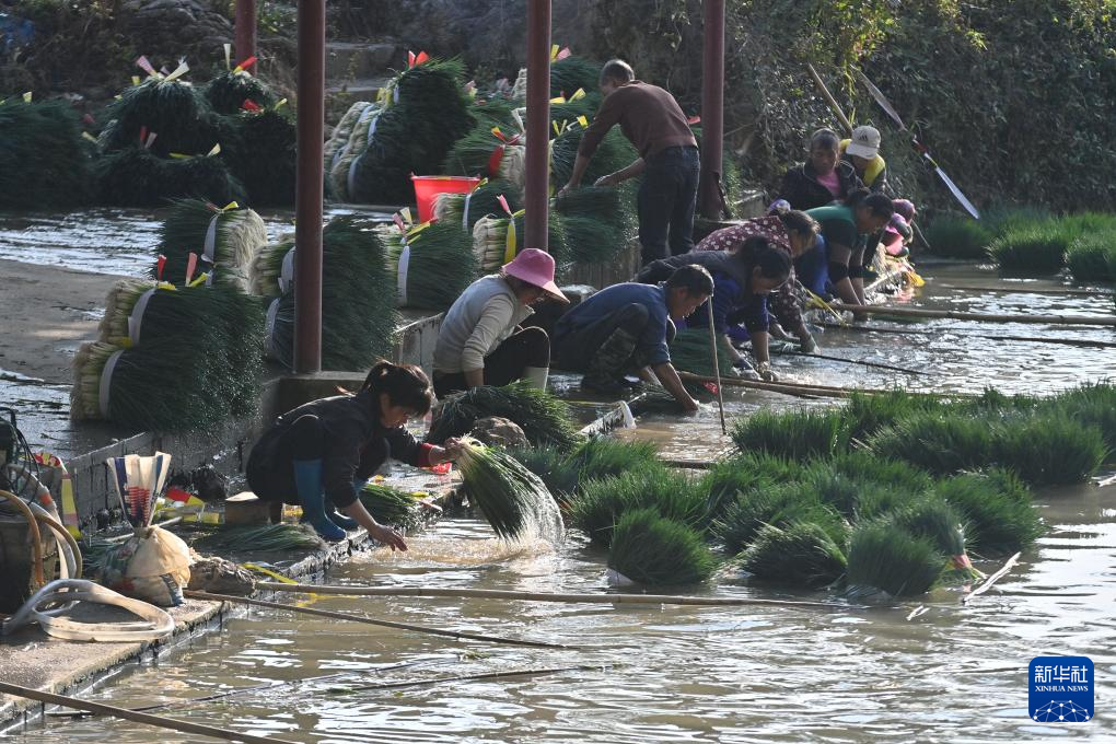 2024年11月2日清晨,覺山村村民在挑選香蔥。
