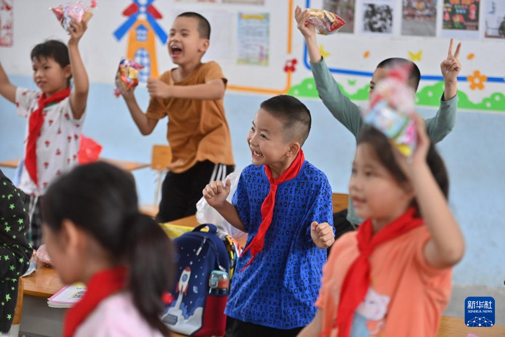 2024年5月31日,在覺山教學點,孩子們在領取兒童節禮物。