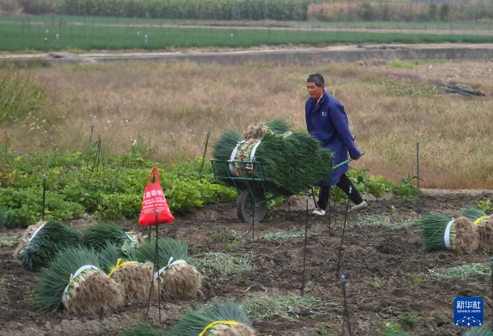 2024年10月27日清晨,覺山村村民在田間收獲香蔥。