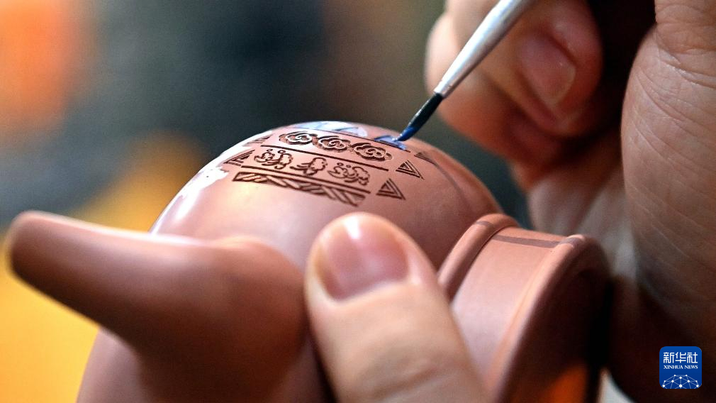 1月2日,郭卉在工作室里為雕刻好的茶壺彩繪。