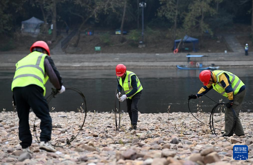 1月8日,工人在漓江邊進行線纜遷改作業。