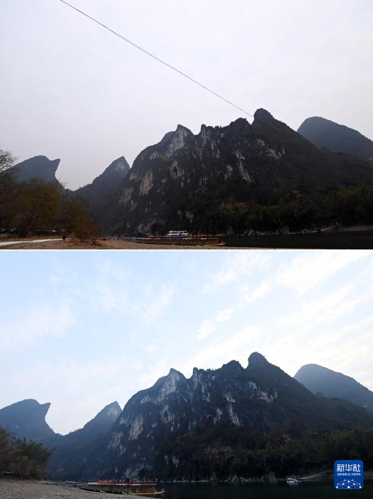 拼版照片,上圖為:線纜遷改前的漓江山水景觀(1月7日攝);下圖為:線纜遷改后的漓江山水景觀(1月8日攝)。