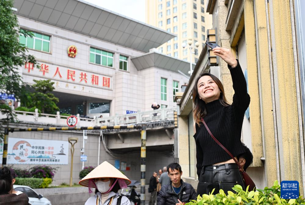 1月8日,游客在東興口岸附近拍照打卡。