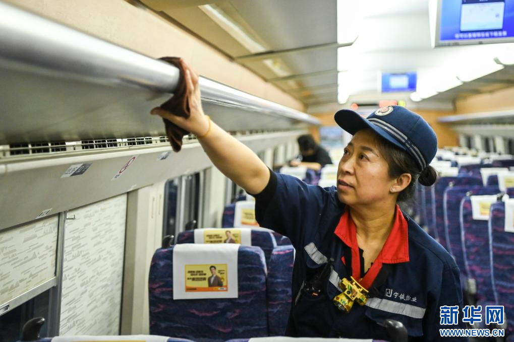 1月14日,在中國鐵路南寧局集團有限公司南寧車輛段南寧動車所,工作人員對車內進行清潔。