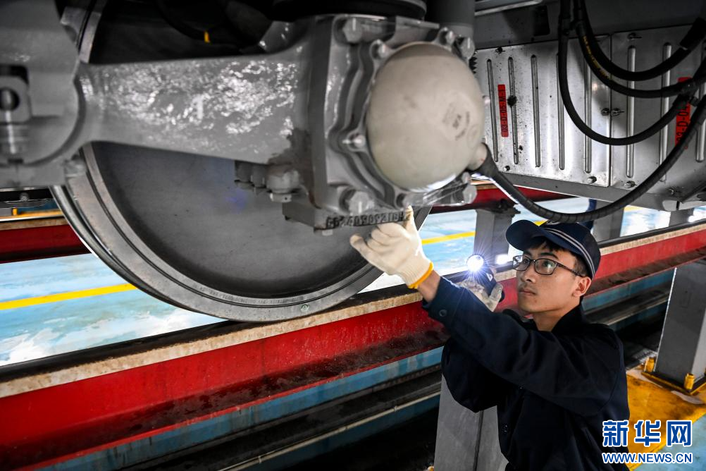 1月14日,在中國鐵路南寧局集團有限公司南寧車輛段南寧動車所,地勤機械師對動車走行部進行檢查。