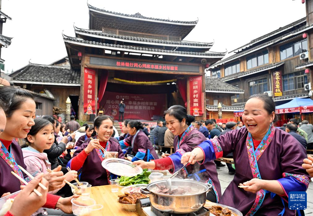 1月22日,在廣西柳州市三江侗族自治縣林溪鎮平巖村巖寨屯,村民在巖寨鼓樓前品嘗“年豬宴”。