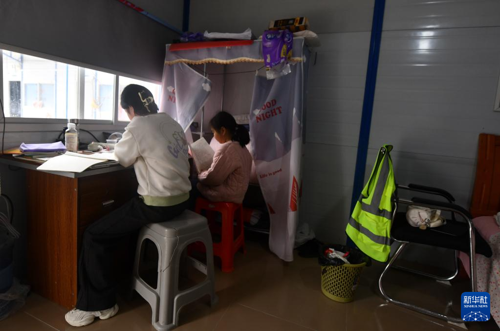在柳州市柳江區三都鎮魚宜高速公路建設工地,今年11歲的陳藝苗(左)在爸爸的宿舍里寫作業(1月23日攝)。