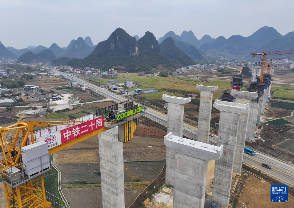 中鐵二十局的工人在柳州市柳江區三都鎮魚宜高速公路建設工地作業(無人機照片,1月23日攝)。